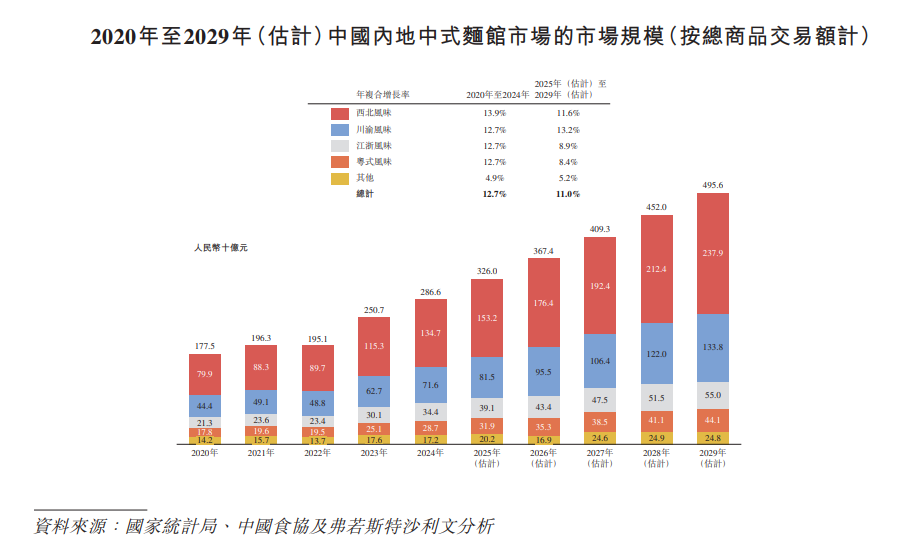 弗若斯特沙利文在相关报告中称,中国中式面馆市场的总商品交易额由2020年的1833亿元增长至2024年的2962亿元,年复合增长率12.7%。而在中式面馆市场中,中国以川渝风味为主的中式面馆市场的总商品交易额从2020年的450亿元扩张至2024年的727亿元,年复合增长率12.8%,预期2029年的总商品交易额将达1357亿元。