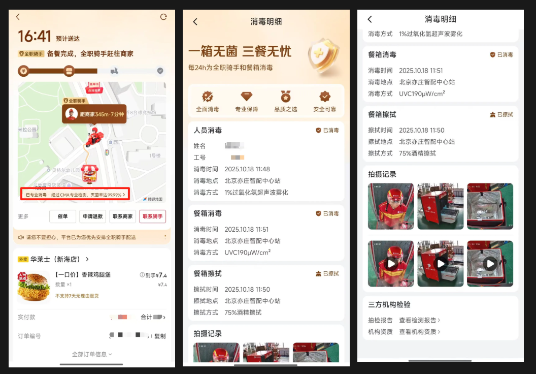 值得一提的是,用户也能亲自感受到新的变化。据介绍,当全职骑手带着消毒后的餐箱给用户送餐时,消费者将在订单页看到餐箱“已专业消毒”提示,还能查看骑手和餐箱当日消毒全过程视频,以及专业机构的检测报告。这些视频全部由现场监控设备自动拍摄上传,真正做到全程可溯源。