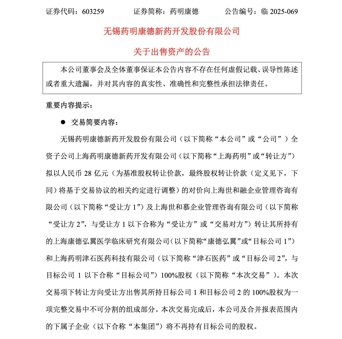 与三季报业绩同时披露的资产剥离公告,为理解药明康德的战略意图提供了重要线索。以28亿元向高瓴投资出售康德弘翼和津石医药100%股权,这一动作并非简单的“卖资产换现金”,而是公司在复杂外部环境下聚焦核心业务、优化资产结构的战略选择。
