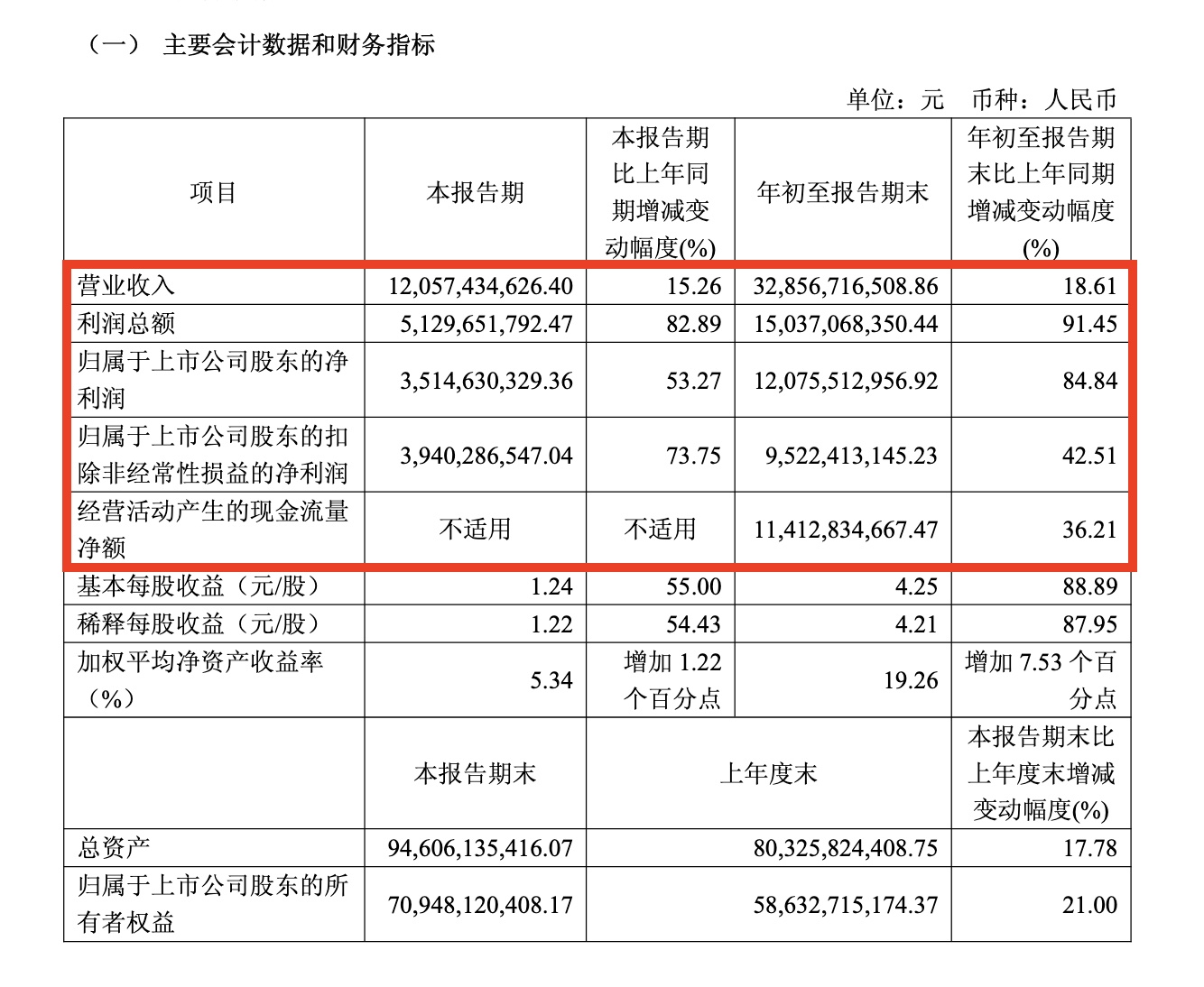 业绩报显示,2025年前三季度,公司实现营业收入328.57亿元,同比增长18.61%;归母净利润120.76亿元,同比增长84.84%;经营现金流108.7亿元,同比增长35%。单看第三季度,公司实现营业收入120.57亿元,同比增长15.26%;归母净利润35.15亿元,同比增长53.27%。