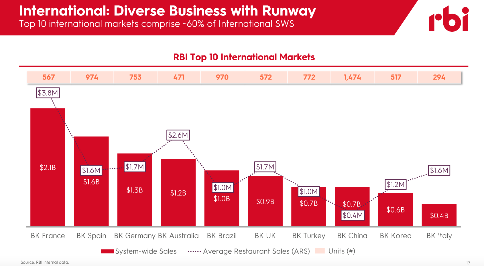 另据RBI集团的年度报告,在RBI集团的国际市场中,2024年,汉堡王中国的收入排名第八,汉堡王中国的系统销售额约7亿美元,单店平均年销售额约为40万美元。