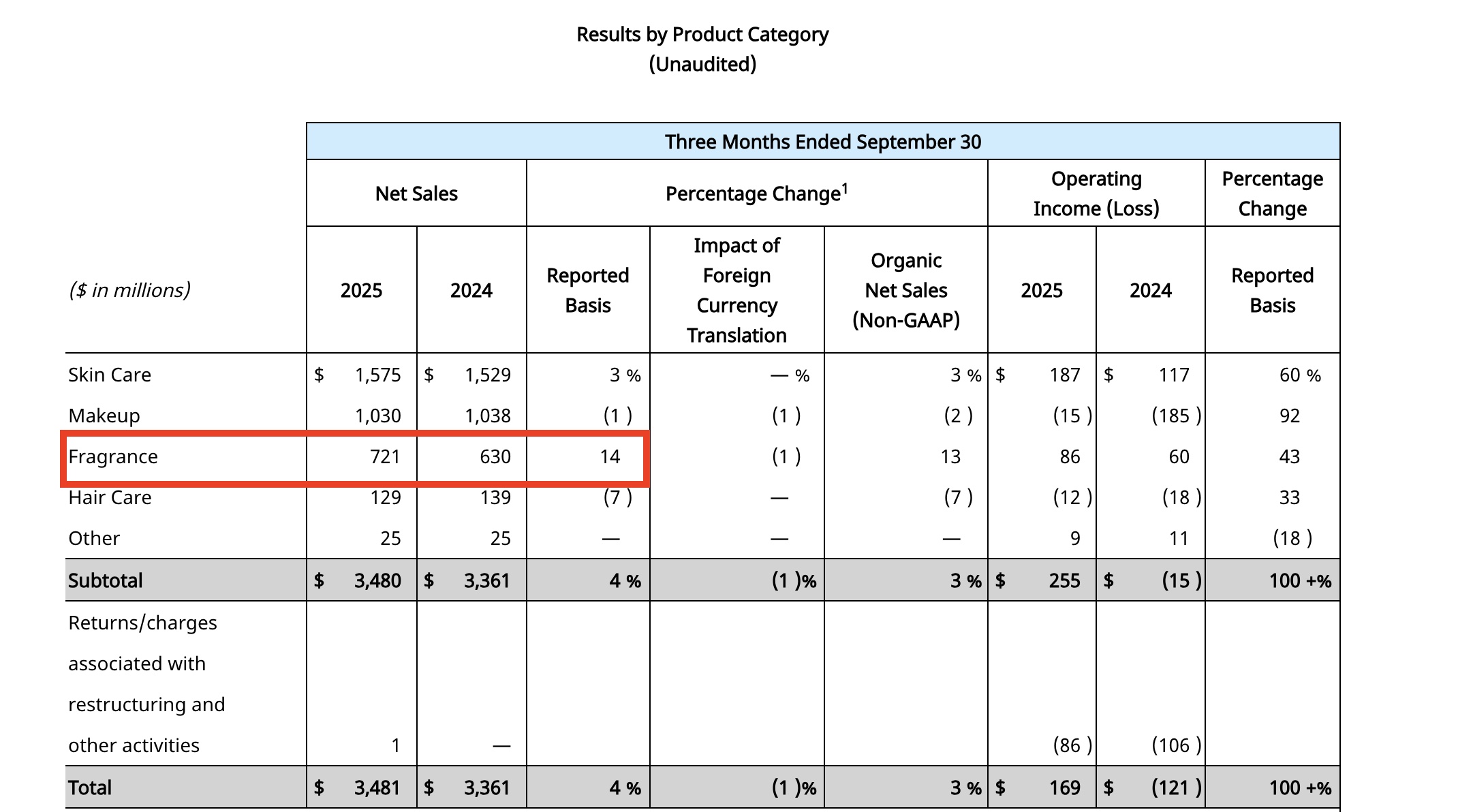 10月30日,雅诗兰黛集团公布2026财年第一季度财报,公告显示,报告期内有机销售额同比增长3%,净销售额达35亿美元,增长4%。这是该公司在经历上一财年第四季度13%的降幅后出现的环比改善。这一业绩相比上一财年第四季度13%的降幅有明显回升。公司将本季度表现归因于其“重塑美妆新境”战略的执行以及利润恢复与增长计划(PRGP)带来的效益。