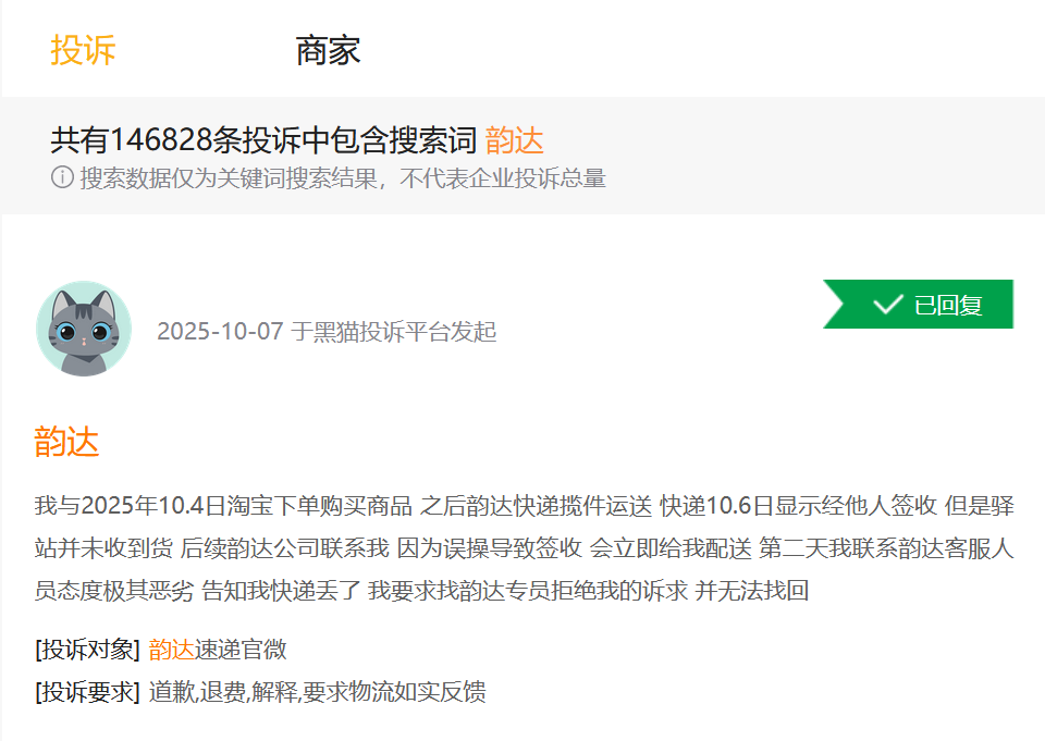 加盟体系的管理失序同时也在影响服务质量与品牌信誉。黑猫投诉平台数据显示,“韵达”相关累计投诉量高达14.68万件,问题主要集中在丢件、损坏、延误等方面。