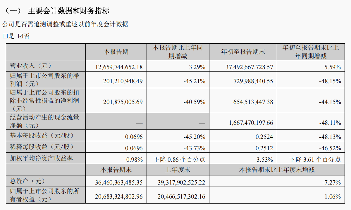 其中,第三季度,公司归母净利润为2.01亿元,同比下降45.21%;扣非归母净利润为2.02亿元,同比下降40.59%。