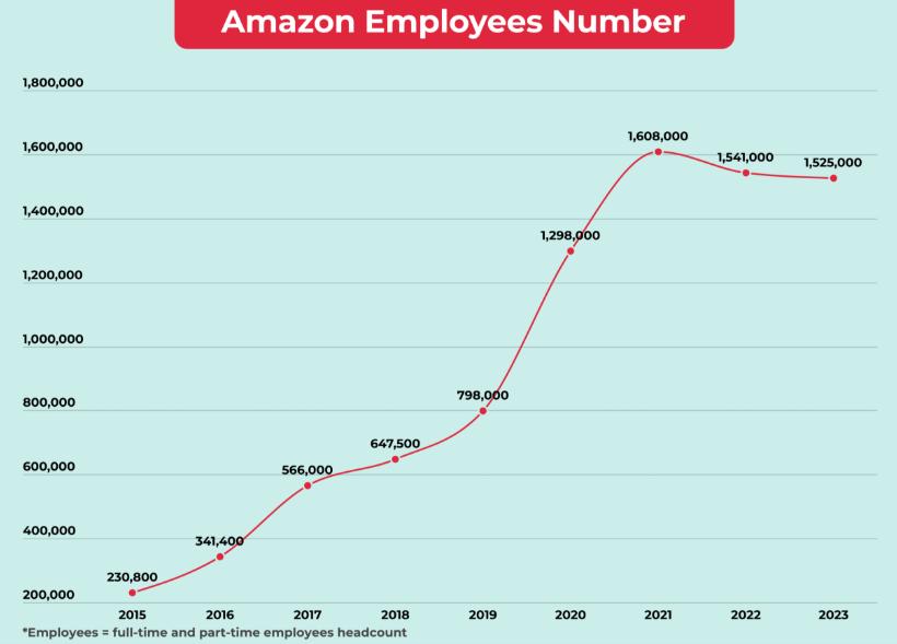 2019年亚马逊的员工总人数为79.8万,但2021年高峰时已经超过160万,翻了一倍以上,目前也还有155万。
