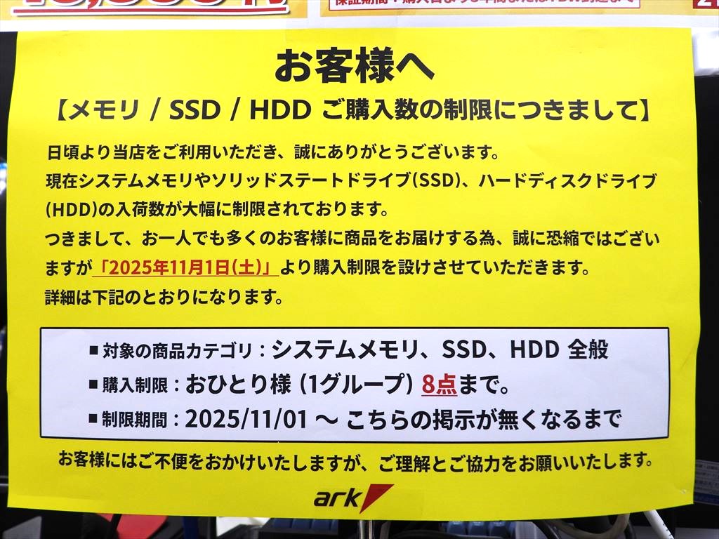 由于库存短缺,秋叶原的多家商店均已出台限购措施。其中PC SHOP Ark限制每人最多购买八件商品。TSUKUMO商店的限制更为严格,每位买家限购两块SSD/HDD硬盘,以及最多四条内存,但购买全新电脑的顾客可以协商获得更高的限额。日媒分析称,未来很可能连目前未实施限购的店铺也会采取类似措施。