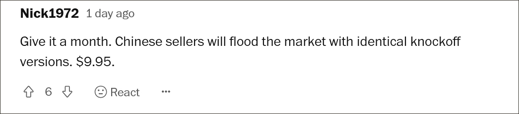有趣的是,还有外国网友提到,“只要一个月的时间,中国的卖家们就会推出大量相同的纺织品,售价可能只要9.9美元。”这位网友的调侃已成真。发售当天,电商平台上已有商家“火速”上架了模仿iPhone Pocket的同款产品,售价在39.9元至61.39元不等。