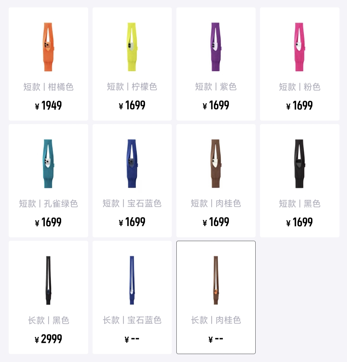 观察者网经查询发现,截至14日中午,苹果官网的长款iPhone Pocket均显示缺货,而短款仅柑橘色售罄,其余配色均可下单。目前,淘宝、京东等电商平台暂未上架这一产品。而得物APP上,短款价格涨至1699元,溢价400元,其中柑橘色售价高达1949元;而长款方面仅黑色仍可下单,价格来到了夸张的2999元。