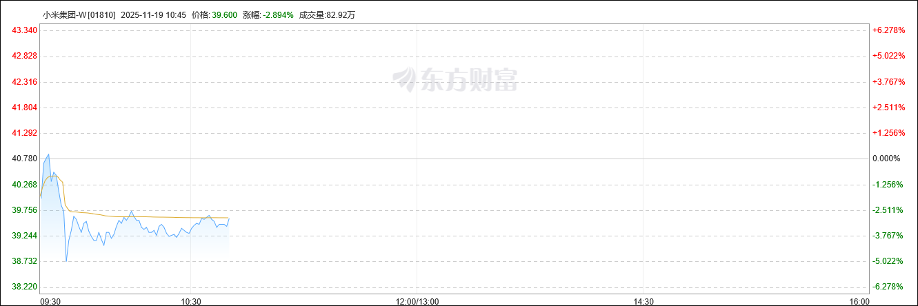 11月19日开盘,小米集团港股走低,一度跌近5%。截至北京时间10点45分,小米港股跌2.89%,报39.6港元/股。