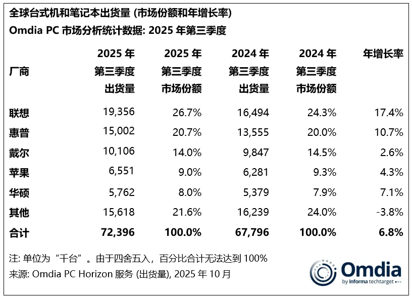 据咨询机构Omdia(原Canalys)公布的数据显示,2025年第三季度,台式机、笔记本及工作站的全球总出货量同比增长6.8%,达到7200万台。其中,笔记本(包括移动工作站)出货量增长4%,达到5720万台;台式机(包括台式工作站)出货量增长17%,达到1520万台。