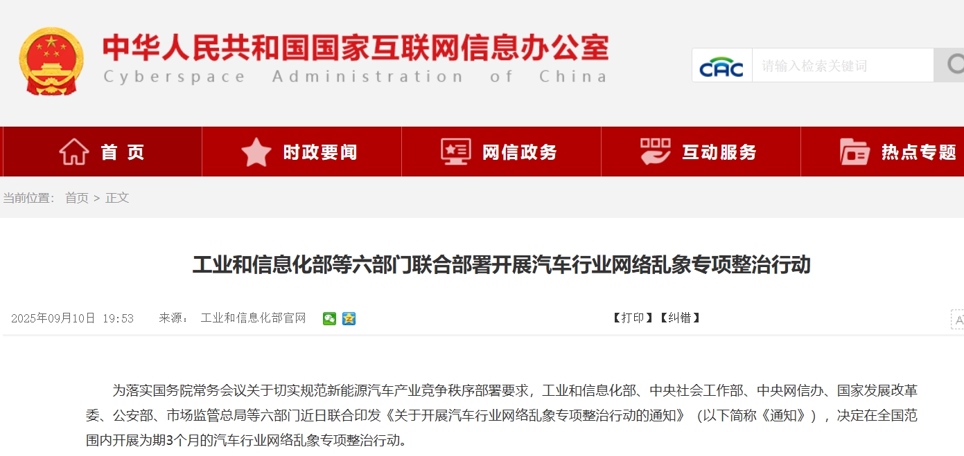 据国家网信办网站9月10日消息,工业和信息化部等六部门已联合部署开展汽车行业网络乱象专项整治行动。本次专项整治行动将集中整治非法牟利、夸大和虚假宣传、恶意诋毁攻击等网络乱象,提升涉汽车企业网络乱象处置质效,督促企业规范营销宣传行为,营造良好舆论环境,护航汽车产业高质量发展。重点整治问题主要包括非法牟利问题、夸大和虚假宣传问题、恶意诋毁攻击问题。