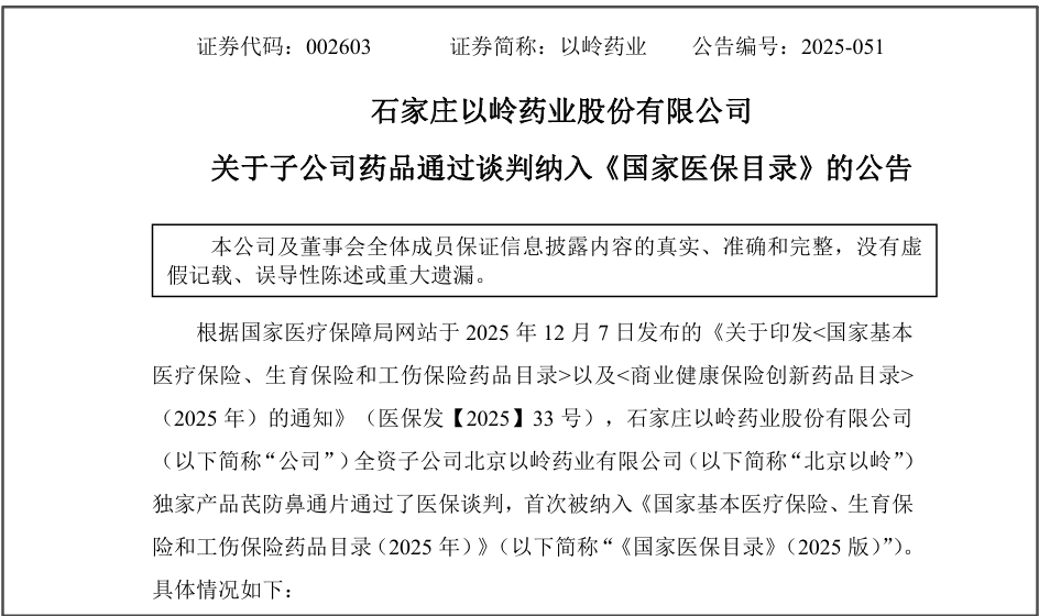 12月7日,以岭药业发布公告称,其独家专利一类新药芪防鼻通片首次被纳入国家医保目录。据悉,芪防鼻通片是治疗持续性变应性鼻炎(即过敏性鼻炎)的创新中药,为过敏性鼻炎患者提供了治疗新选择。
