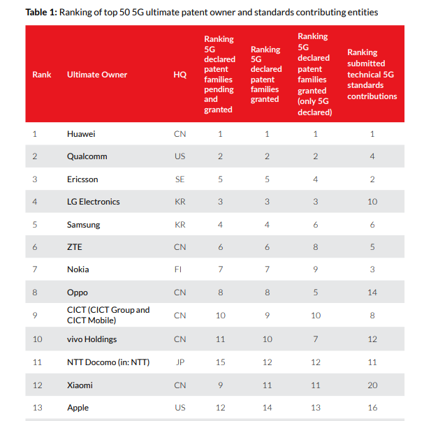 知识产权分析机构LexisNexis发布的统计数据显示,截至2025年1月,华为5G专利综合实力位居榜首,高通、爱立信分居第二、第三名。排名前十中有半数为国内企业,包括中兴通讯(第六名)、OPPO(第八名)、中国信科集团(CICT,第九名)、vivo(第十名)。此外,小米排名第十二名,苹果第十三名。