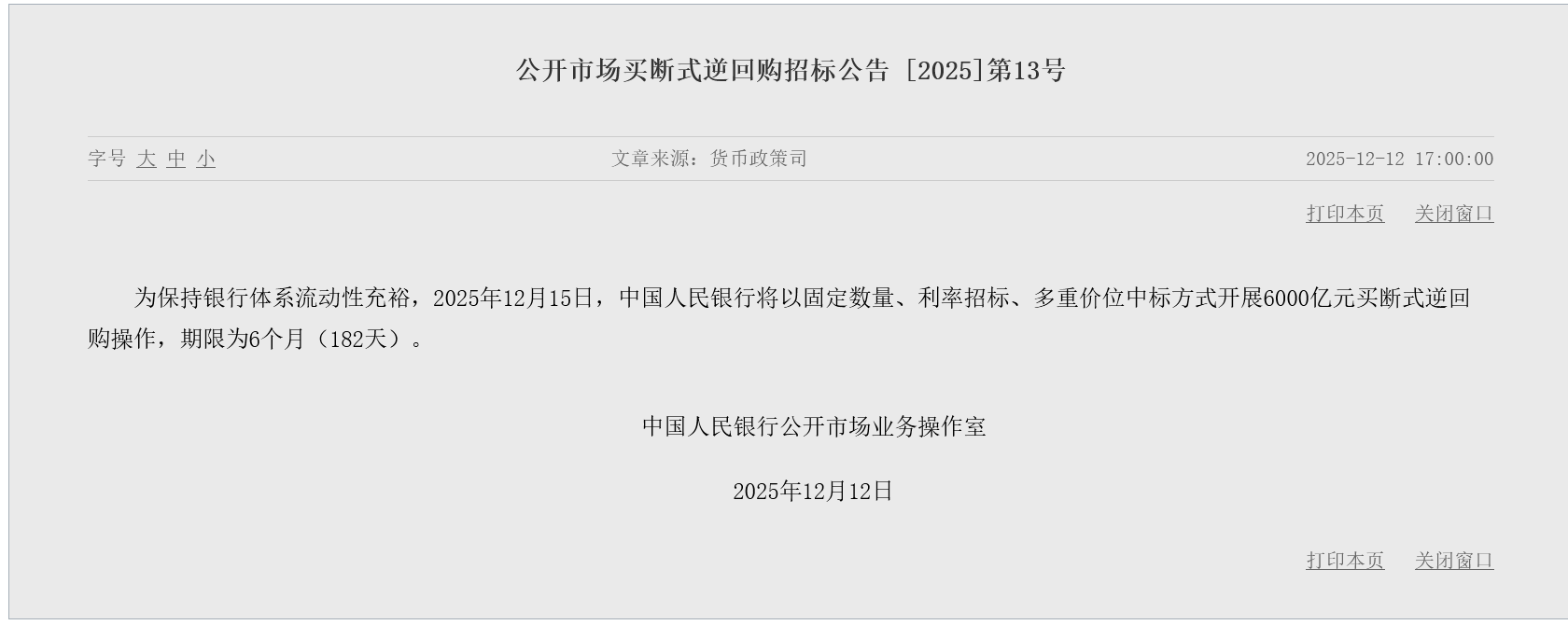据中国人民银行网站消息,央行12月12日公告称,为保持银行体系流动性充裕,将于12月15日以固定数量、利率招标、多重价位中标方式开展6000亿元买断式逆回购操作,期限为6个月(182天)。