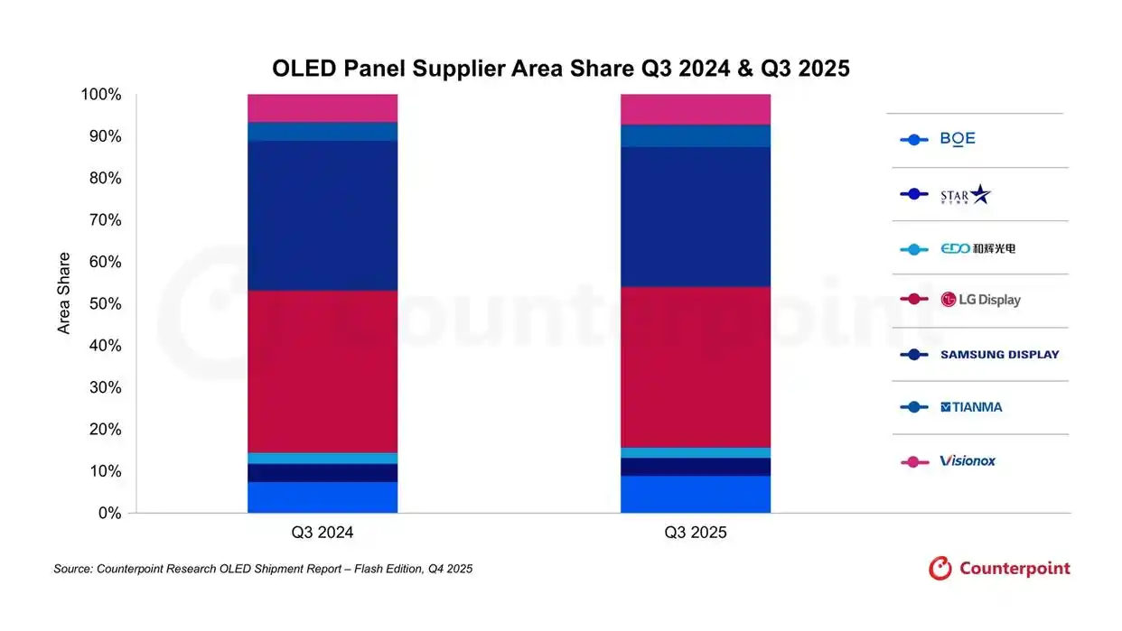 CounterPoint Research最新发布的报告显示,2025年第三季度,全球OLED面板出货量环比增长14%,同比增长5%。