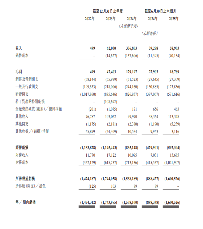 招股书披露,2022年、2023年、2024年、2025年1-6月,壁仞科技收入分别为49.9万元、6203万元、3.37亿元、0.59亿元,净利润分别为-14.74亿元、-17.44亿元、-15.38亿元、-16.01亿元,研发费用分别为10.18亿元、8.86亿元、8.27亿元、5.72亿元。2022年至2025年6月,公司累计净亏损已超63亿元。同期,其毛利率分别为100%、76.4%、53.2%、31.9%。
