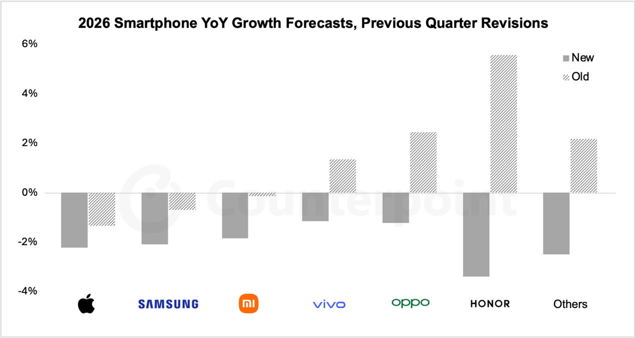 2026 年智能手机出货年增率预测与修正 图片转自Counterpoint咨询
