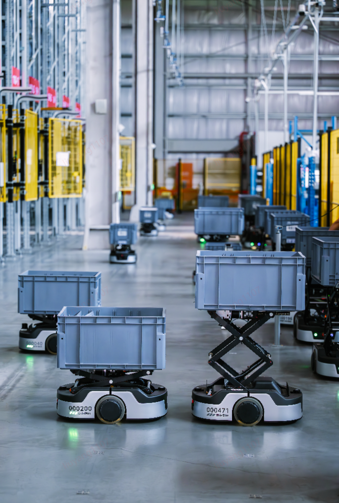 通过飞梯机器人空中拣选、搬运机器人自动转运的 "货找人" 模式,仓库实现了拣货及出库效率约4倍的提升。