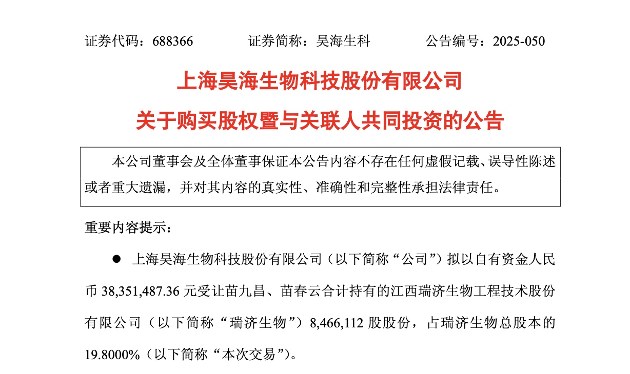在此背景下,昊海生科仍在推进资本运作。12月12日,公司公告拟以3835万元收购瑞济生物19.8%股权,布局生物羊膜赛道。值得注意的是,瑞济生物的股东中包括实控人游捷等关联方,且标的公司2024年及2025年前三季度均为亏损状态,本次交易未设置业绩对赌安排,投资风险不容忽视。