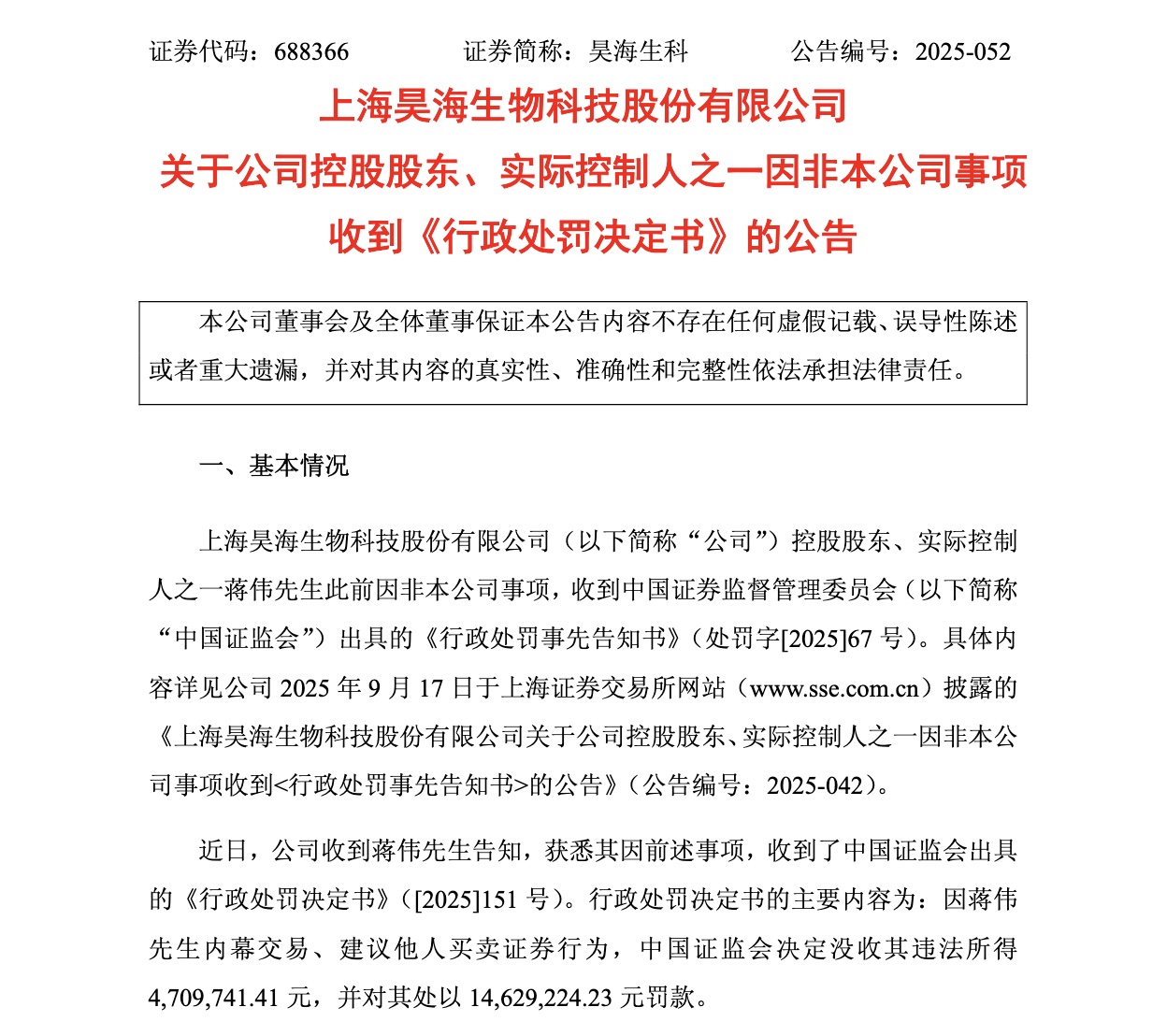 12月23日晚间,“医美三剑客”之一昊海生科(688366.SH)发布公告,公司控股股东、实际控制人之一蒋伟因内幕交易、建议他人买卖证券行为,被中国证监会没收违法所得470.97万元,并处以1462.92万元罚款,合计罚没金额达1933.89万元。至此,历时七个月的调查程序正式落幕。