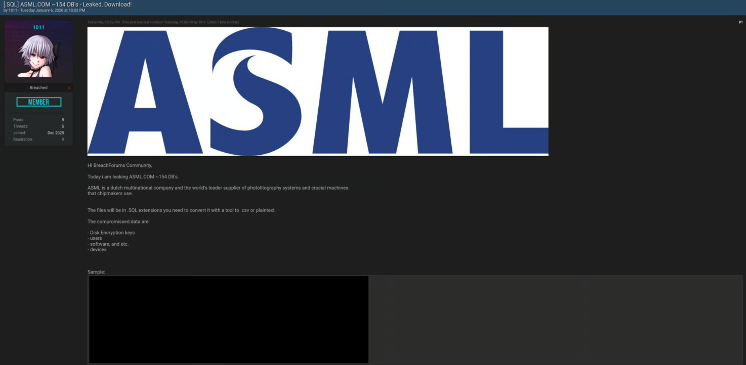 “1011”在暗网论坛“BreachForums”发帖称,其成功入侵了ASML的系统并窃取了大量数据,包含用户信息、软件数据、磁盘加密密钥以及特定设备的详细信息等高度敏感内容,甚至在贴文中提供了所谓的“样本数据”,以提高其可信度。
