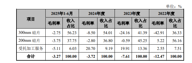 具体来看,300mm 硅片毛利率分别为-42.91%、-24.16%和-8.50%,200mm硅片毛利率分别为5.22%、-0.59%和-2.80%;受托加工服务毛利率分别为2.55%、19.91%和 20.70%,综合毛利率低于同行业可比公司毛利率平均水平。